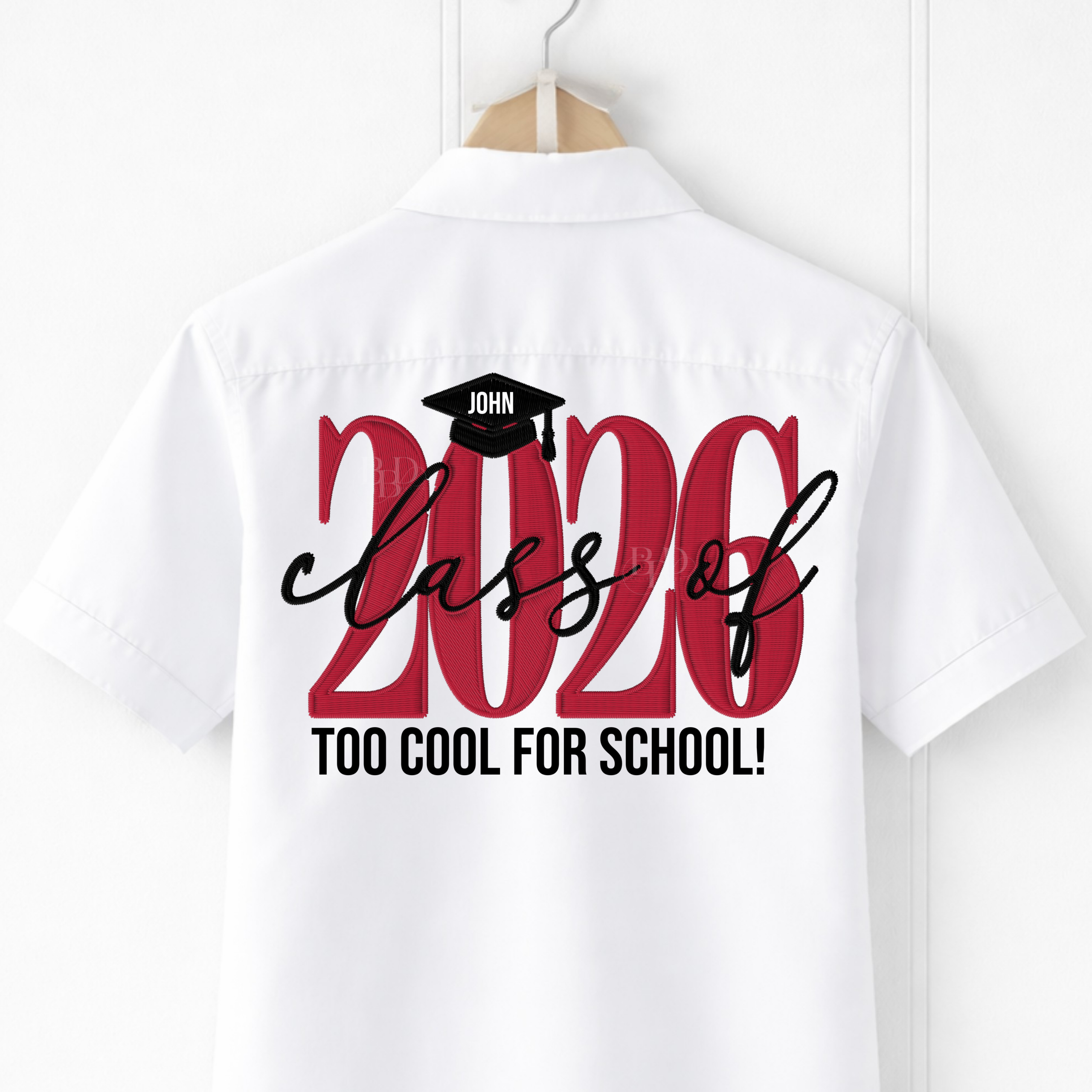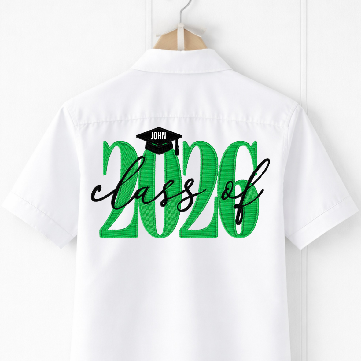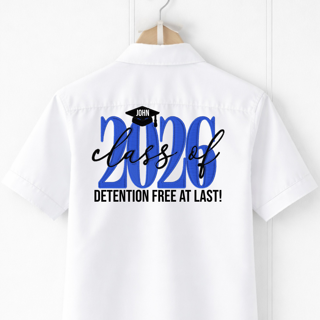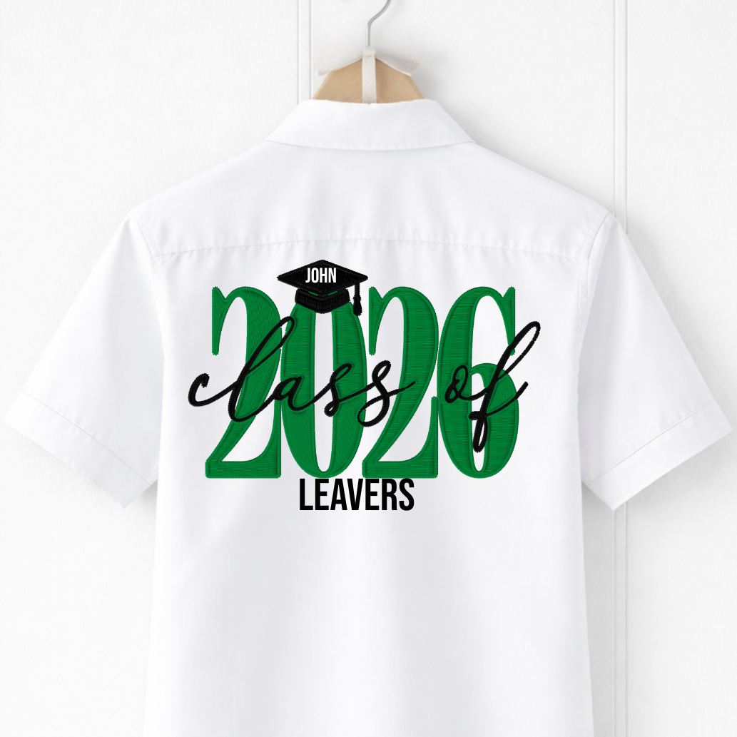 Design Details : This shirt features “2026” in an embroidered-style design, finished with a graduation cap personalised with the leaver’s name.