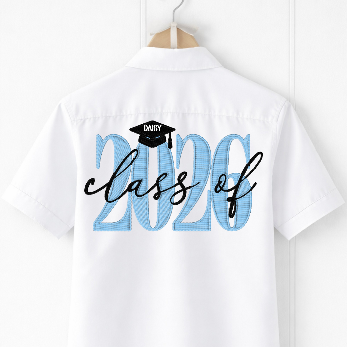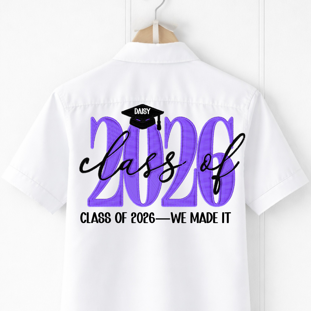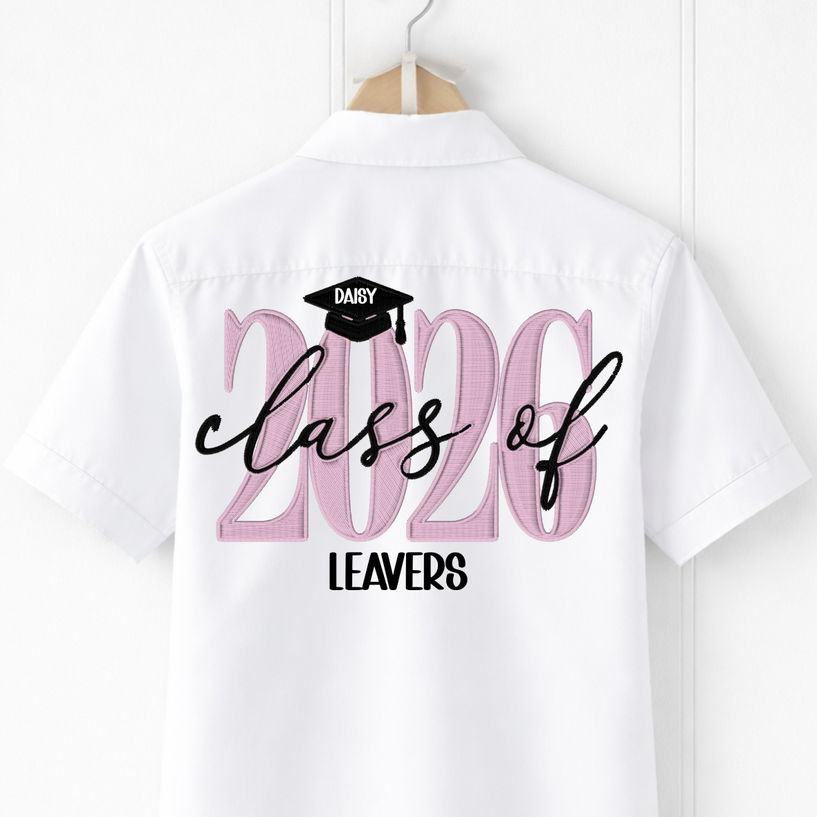 Design Details : This shirt features “2026” in an embroidered-style design, finished with a graduation cap personalised with the leaver’s name.