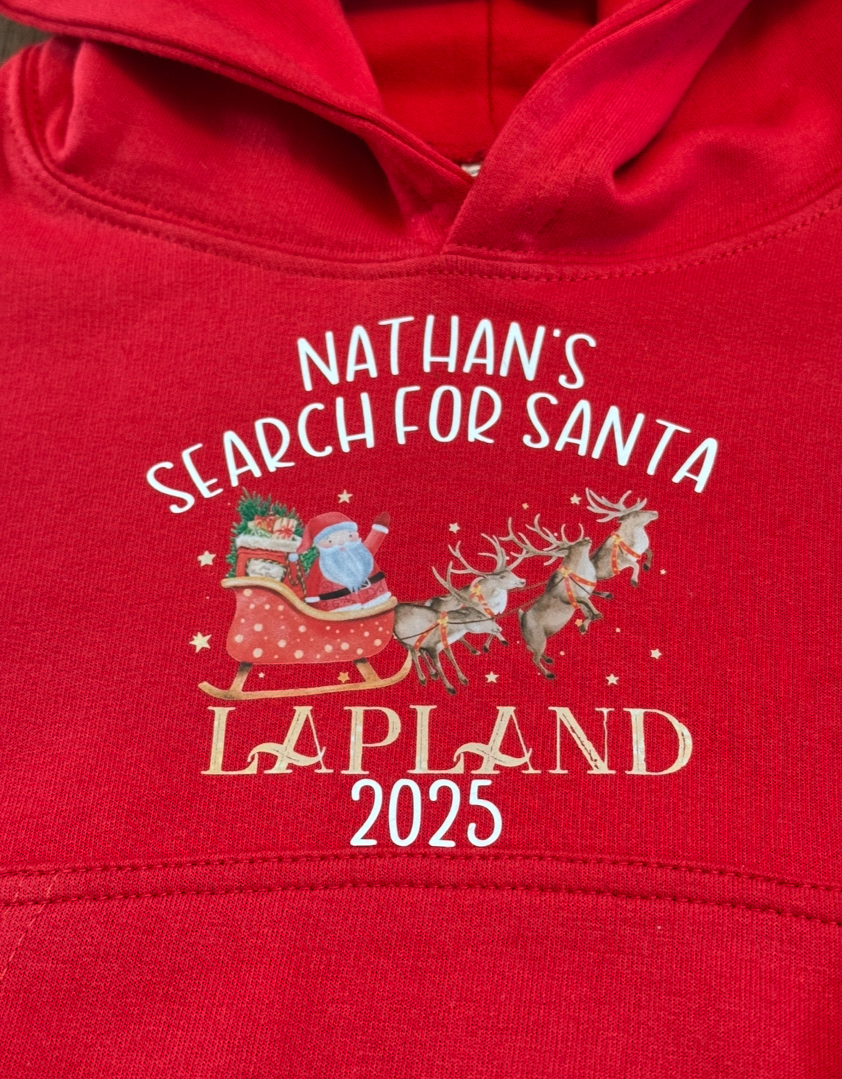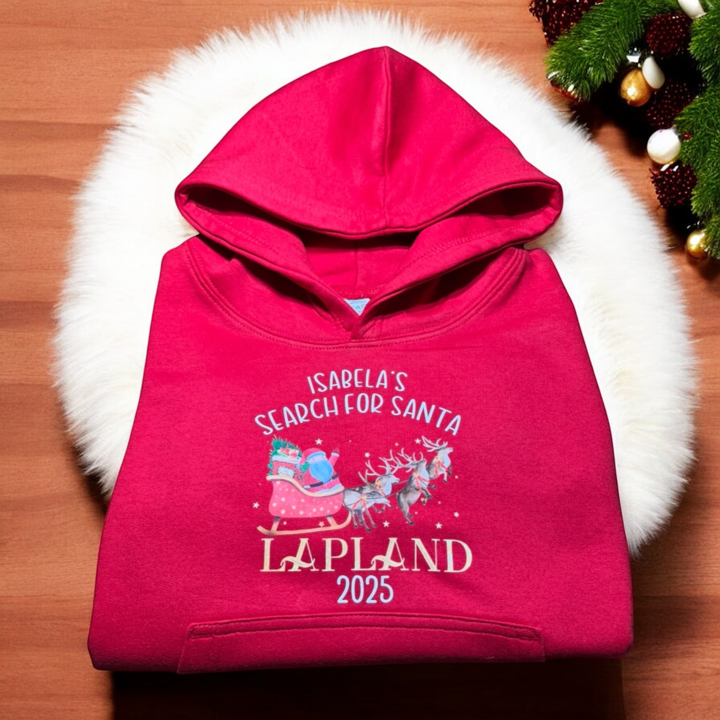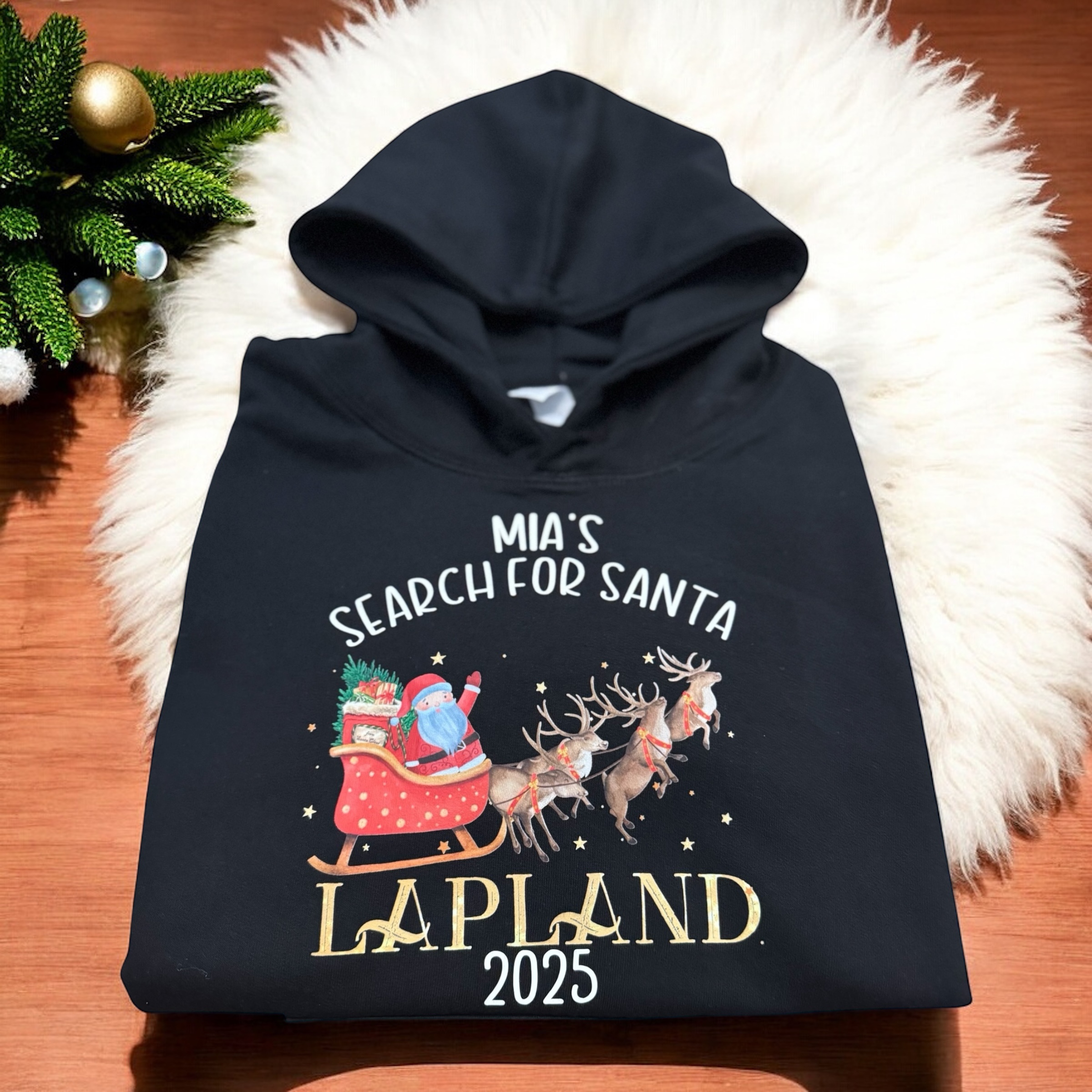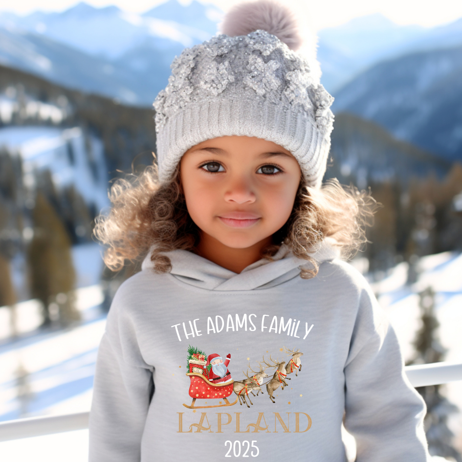 Our Lapland Hoodies are designed to bring the magic of Christmas to life, featuring Santa in his sleigh, reindeer flying high, and a sack full of presents, all finished with a stunning shimmering gold “LAPLAND”design.