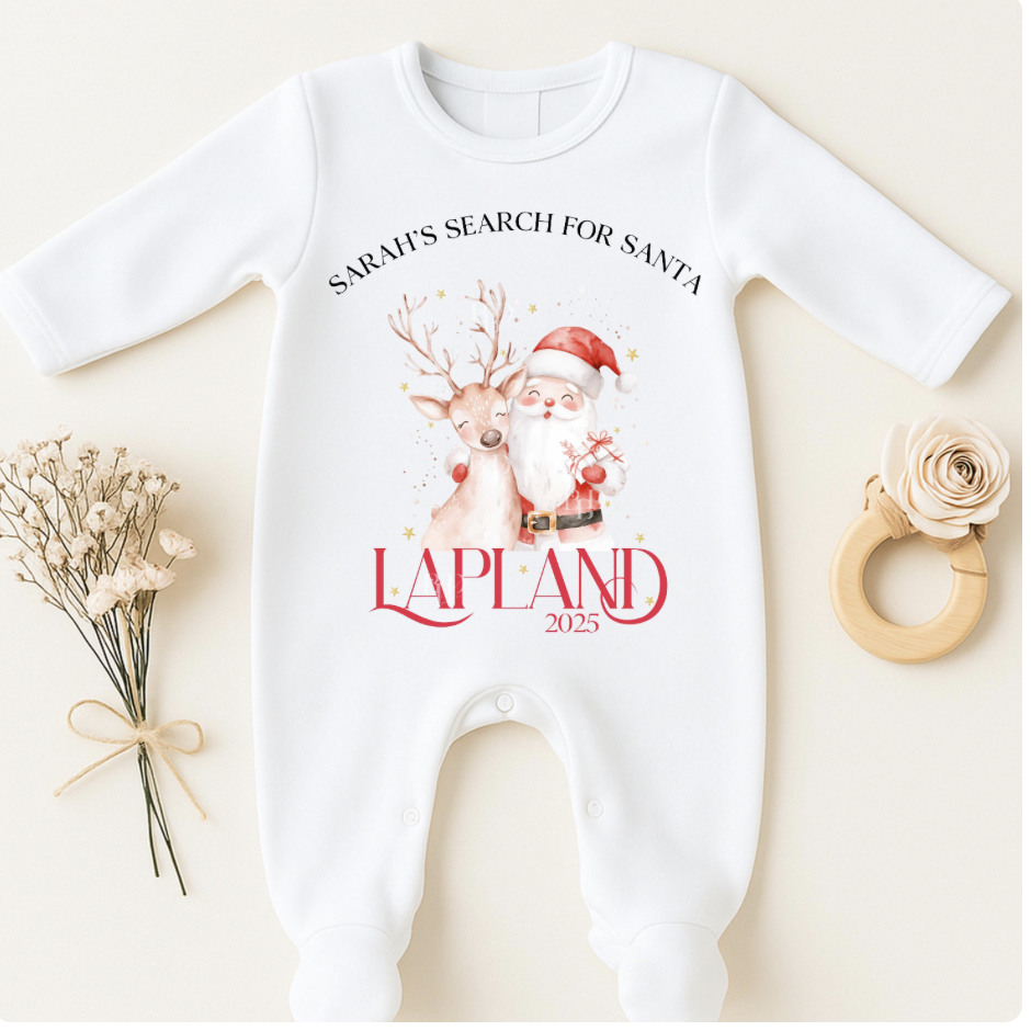 Gorgeous personalised Santa and his reindeer jumper, babygrow, or bib.