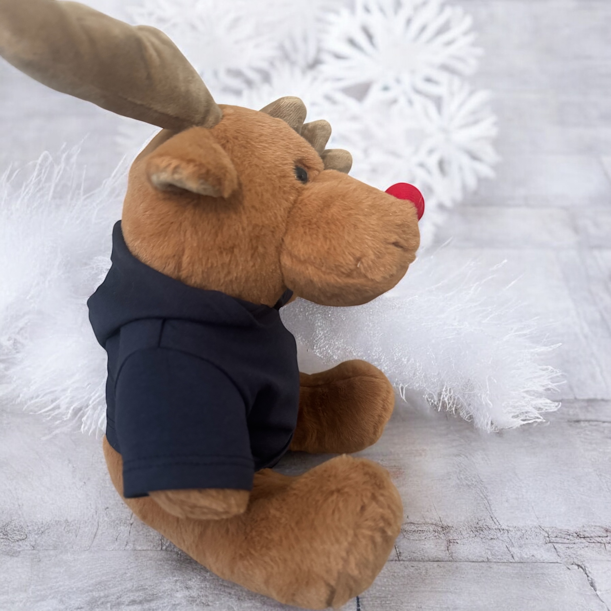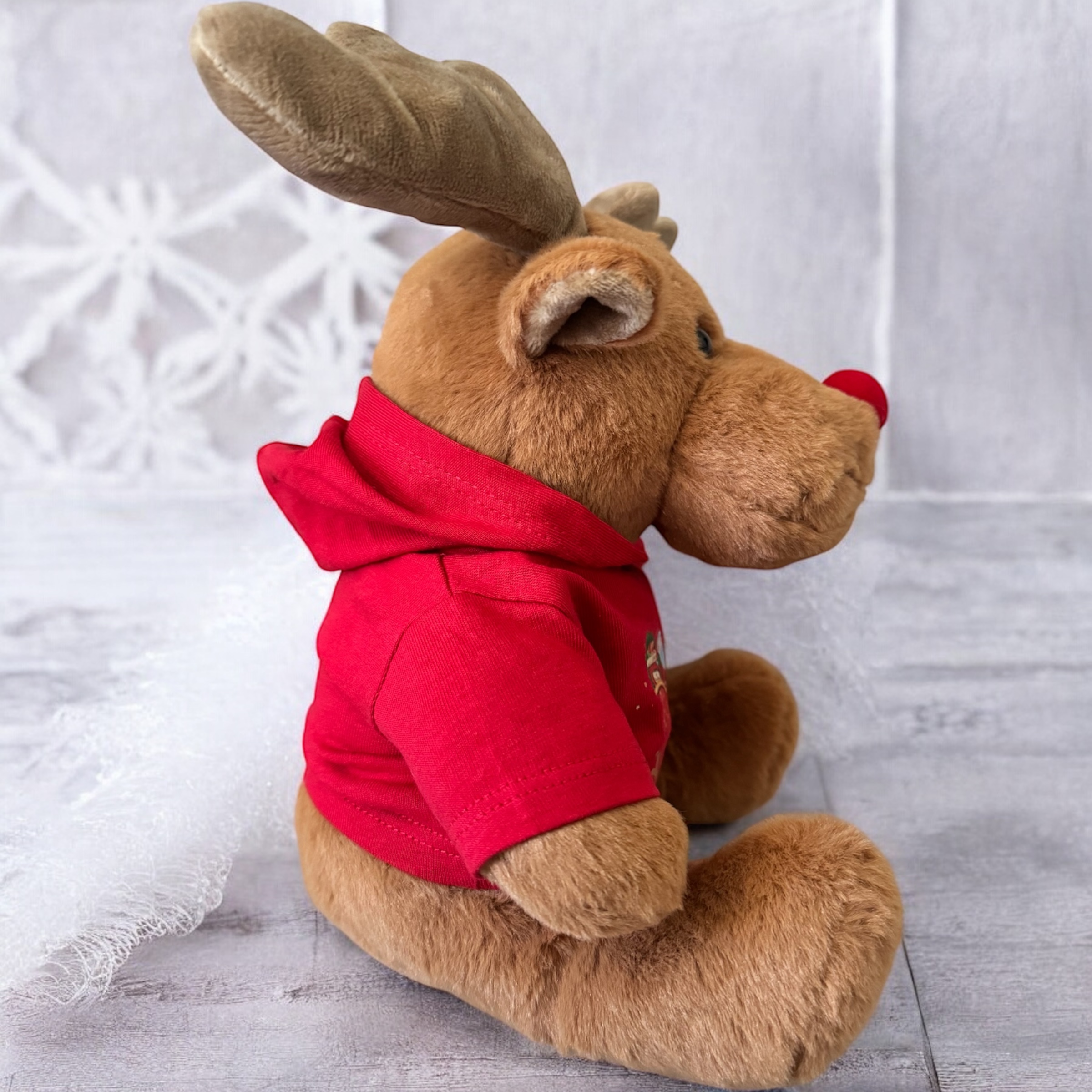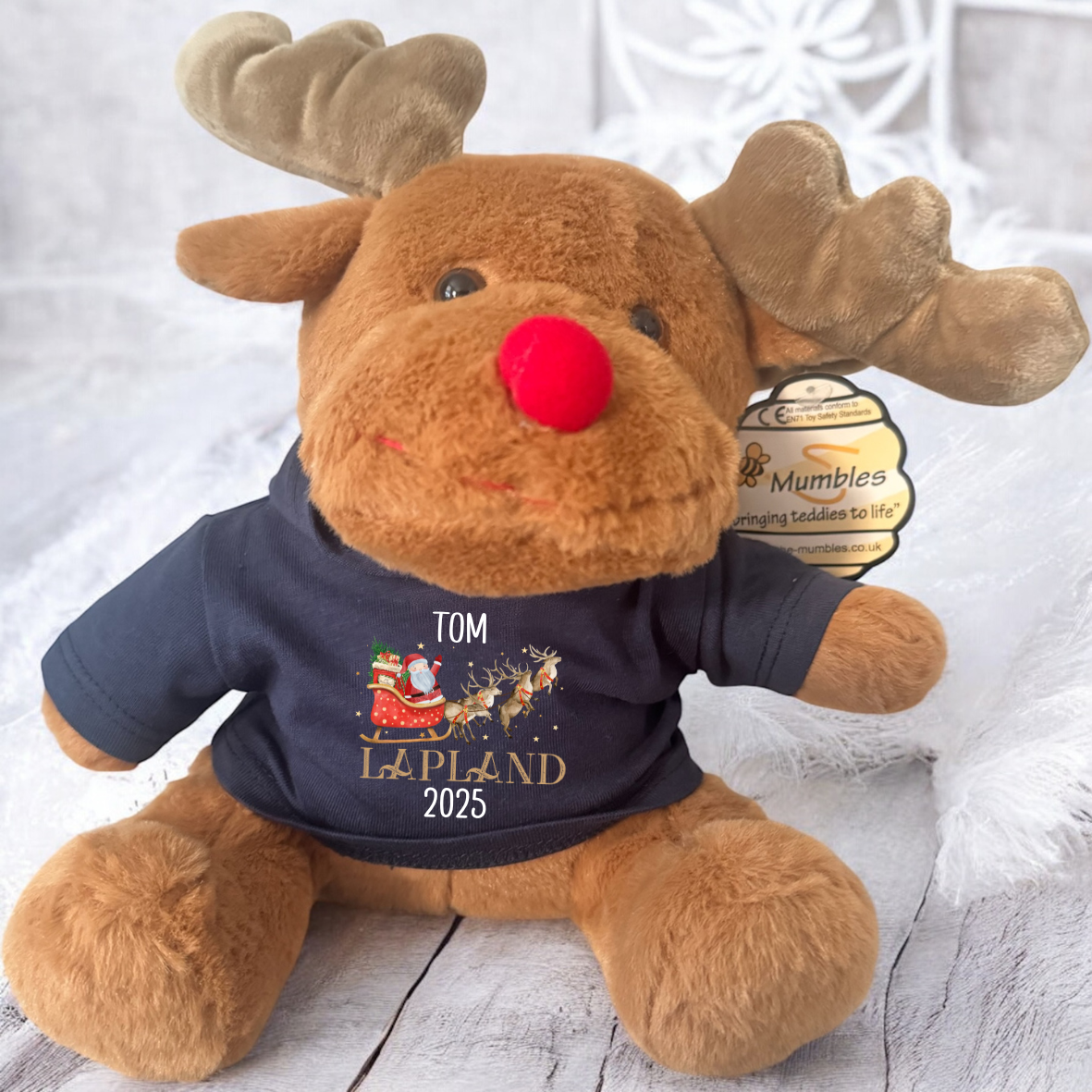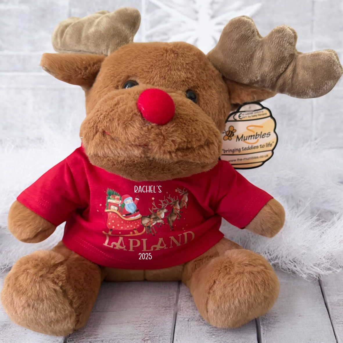 Dressed in a soft red T-shirt hooded t-shirt, this charming reindeer features a bright red nose and a warm, friendly smile. Personalise the T-shirt with your child’s name alongside the wording “Lapland ”, and even add the year for that extra-special touch — creating a truly unique and thoughtful keepsake they’ll treasure forever.